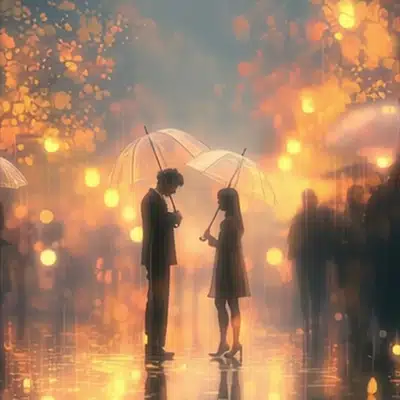 Imagine a digital landscape painted with the soft, romantic hues of a rainy day. Raindrops delicately splatter over an ethereal couple, their silhouettes framed against the gentle glow of streetlights. This galaxy theme not only captures the wistfulness of rain but also adds a splash of warmth and subtle romance to your device.