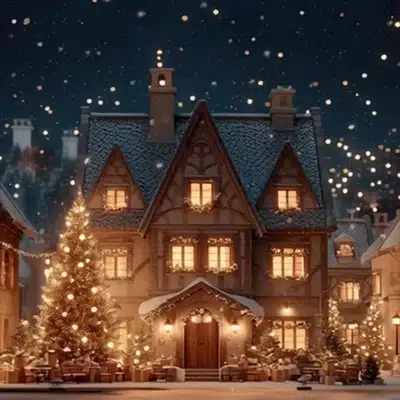 Imagine the warmth of a glowing, festooned mansion amidst softly falling snowflakes right on your screen. The stunning visuals of this samsung theme invite you into a cozy holiday escape every time you unlock your phone. The image of a grand mansion illuminated by twinkling lights and a majestic Christmas tree sets the perfect holiday mood.